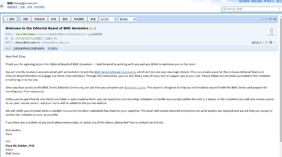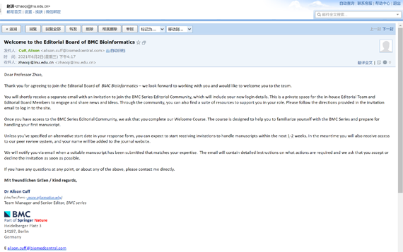 近日,开云官方网页版计算机与软件工程学院教授赵琪收到BMC出版集团Dylan Smith博士邀请,受邀分别担任BMC Genomics和BMC Bioinformatics编委。