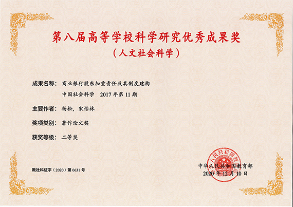 近日,教育部颁发第八届高等学校科学研究优秀成果奖(人文社会科学)证书,我校经济与法律学院宋怡林教授的合撰论文《商业银行股东加重责任及其制度建构》,获得著作论文类二等奖。