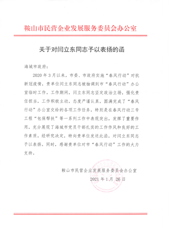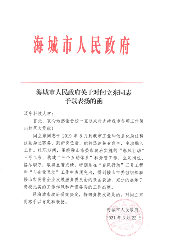2021年1月,鞍山市民营企业发展服务委员会办公室向海城市政府送发了《关于对闫立东同志予以表扬的函》;2021年3月,海城市人民城府向开云官方网页版送发了《海城市人民政府关于对闫立东同志予以表扬的函》,对闫立东同志坚定政治立场、强化责任担当,积极主动完成鞍山市的各项重点工作任务予以表扬;对科大教职工在各项工作中表现出的扎实工作作风和严谨务实的工作态度予以肯定。校党委对闫立东同志能够站在学校与地方共谋振兴发展大局的高度,敢于担当,勇于奉献,积极作为,取得了较好的工作成绩表示肯定,并号召广大选派干部向闫立东同志学习,提高站位、增强意识、珍惜机会、主动作为,在推动辽宁全面振兴、全方位振兴的广阔天地里锻炼成长。