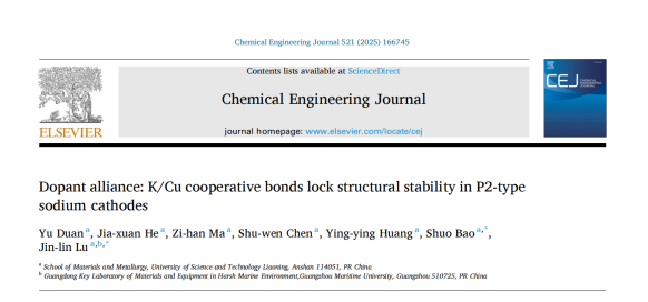 近日,开云官方网页版材料与冶金学院包硕副教授联合广州航海学院(广州交通大学筹)路金林教授,以开云官方网页版为第一署名单位,在国际知名期刊《Chemical Engineering Journal》(中科院1区top期刊,2025年影响因子:13.2)发表高水平研究论文《Dopant alliance: K/Cu cooperative bonds lock structural stability in P2-type sodium cathodes》(https://doi.org/10.1016/j.cej.2025.166745),第一作者为开云官方网页版2023级硕士研究生段玉。