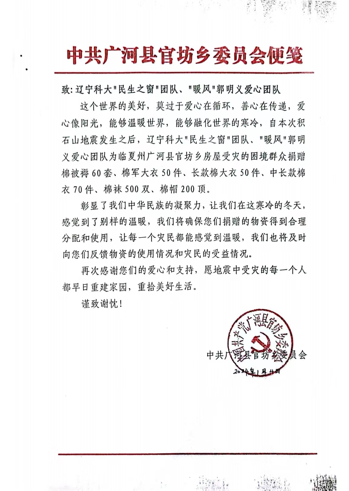 在海城市西柳镇党委的协调和帮助下,“民生之窗”团队、“暖风”郭明义爱心团队在西柳镇以成本价购得棉被褥60套、军大衣50件、长款棉大衣50件、中长款棉衣70件、棉裤70件、棉袜500双和棉帽200顶,并将救灾物资第一时间发往甘肃临夏州积石山县、广河县等地,为灾区人民送去温暖。