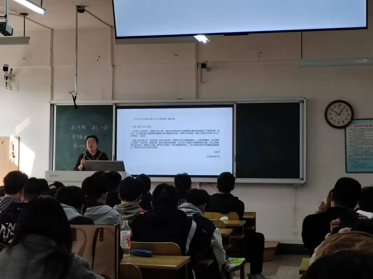 班会中,为更加深入学习领会党的二十届三中全会精神,各位老师高度重视教育内容选取,切实增加实际案例和实践比较的讲授比重,帮助同学们了解召开党的二十届三中全会的重大意义、进一步全面深化改革的指导思想和总体目标,进一步全面深化改革的重大原则、重大举措等,引导学生将思想和行动统一到学习贯彻党的二十届三中全会精神上来。针对“学习习近平同志《论教育》和习近平总书记在全国教育大会上的重要讲话精神”教育主题,各位老师以鲜活的实践、生动的案例和详实的数据为支撑,教育引导广大学生全面领会教育强国的科学内涵,深刻领悟“两个确立”的决定性意义、增强“四个意识”、坚定“四个自信”、做到“两个维护”,坚定理想信念,厚植爱国主义情怀,把个人理想追求融入党和国家事业之中。与此同时,各位老师积极带领同学们学习《习近平给中国一重产业工人代表的回信》和《习近平给中国海洋大学全体师生回信》,深刻领悟信中强调的科技创新重要性以及对青年一代的殷切期望,鼓励同学们坚守技能报国初心,弘扬劳模精神、劳动精神、工匠精神,苦练内功、提高本领,将个人成长与国家需求紧密结合,为国家发展贡献青春与智慧。