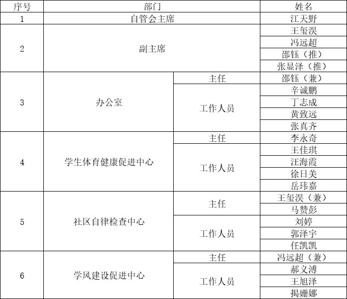 为搭建学生自主发展平台,建设优良的学习学风,充分发挥学生在自我管理中的积极作用,强化学生自我约束能力和自我提升意识,助力学生在实践中成长,激发学生责任感和主动学习的意识,通过个人申请,资格审查,民主选举等等环节,现拟任命江天野等21名同学为材料与冶金学院第十六届学生自我管理委员会成员。现将材料与冶金学院第十六届学生自我管理委员会成员名单公示如下:
