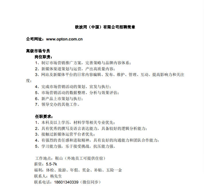 欧波同(中国)有限公司招聘简章