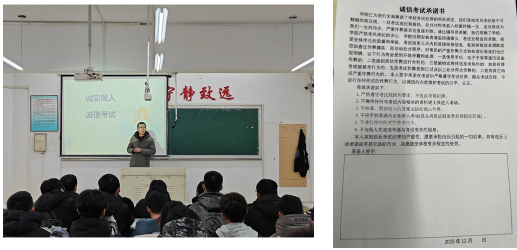 各专业班级通过主题班会等方式开展诚信考试宣传教育,辅导员带领全体同学认真学习了《开云官方网页版学生考试违纪处理细则》等文件,并通报了以往因考试作弊受到处分的案例、严重后果。帮助同学们从思想上认识到诚信考试的重要性和必要性,全体学生签署了《诚信考试承诺书》,承诺依靠自己的努力学习取得优异成绩。