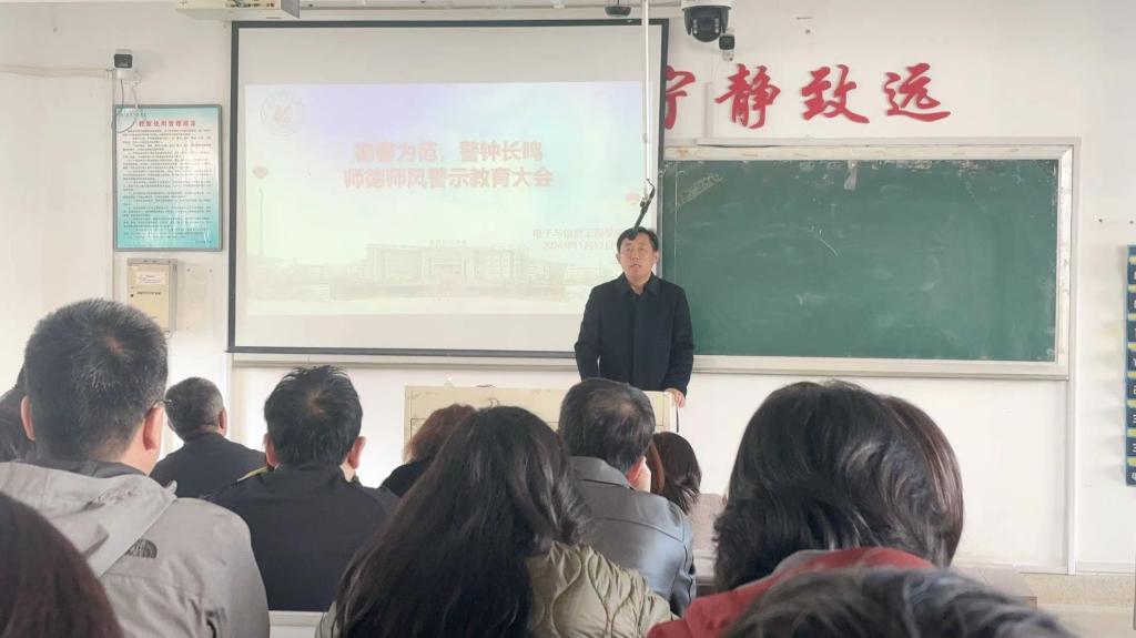 2024年11 月 12 日下午,电信学院召开了师德师风警示教育大会。会议由学院党委书记王会立主持。会议通报了两起学校教师师德师风失范的典型案例。他指出,全体教职工要以此为鉴,深刻汲取教训,时刻绷紧师德师风这根弦,坚决不触碰师德师风底线。