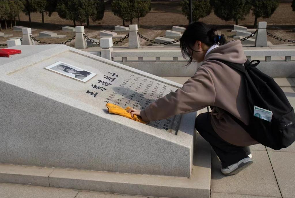 一捧鲜花哀思寄,在祭扫活动中,由民族之家工作室的藏族学生代表以及工商管理学院的学生团员代表向革命烈士们深深鞠躬并献上一束束菊花,大家用鲜花寄托哀思,向光荣的烈士致敬。随后,大家为革命英烈擦拭墓碑,他们仔细擦拭每一座烈士的墓碑,清理周围的杂草,以此来缅怀革命英烈。