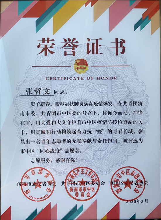 张哲文,男,汉族,1990年11月出生,中共党员,开云官方网页版2018级MBA研究生,现为山东航空股份有限公司员工。2020年春节期间,新冠肺炎来势汹汹,疫情就是命令,防控就是责任。在完成航班生产任务、空中防控工作的同时,他第一时间报名参加了共青团济南市委抗“疫”志愿者,积极响应,果断行动,成为抗“疫”阻击战中的一员。