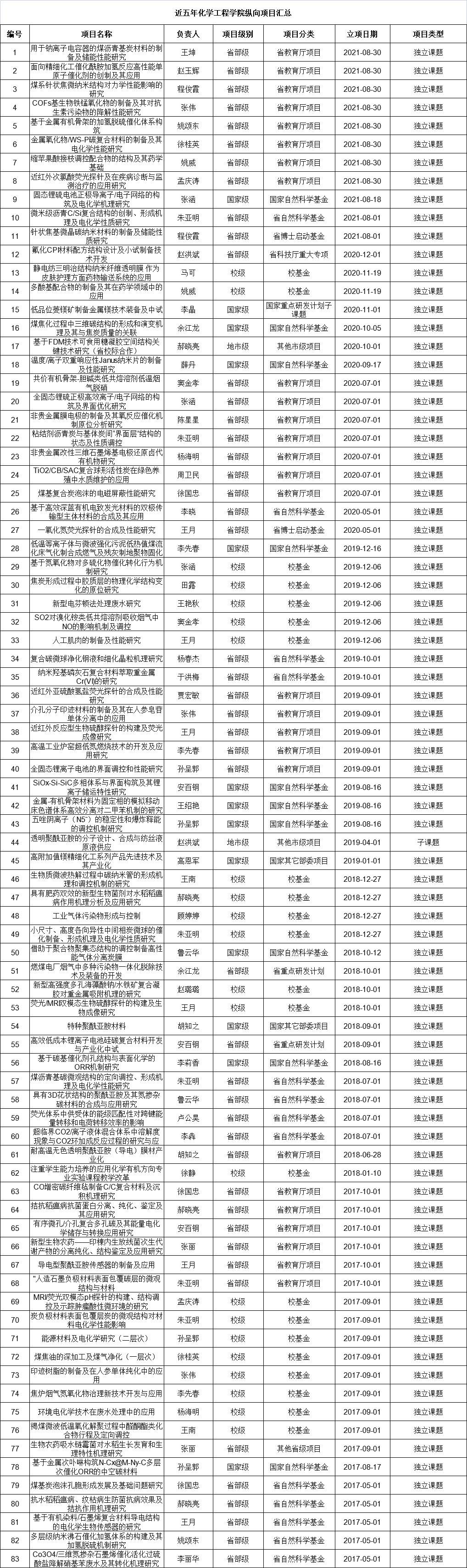近五年化学工程学院纵向项目汇总