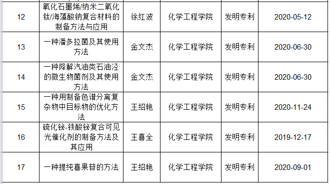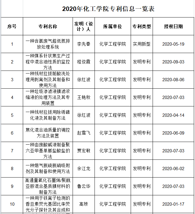 2020年化学工程学院专利成果汇总