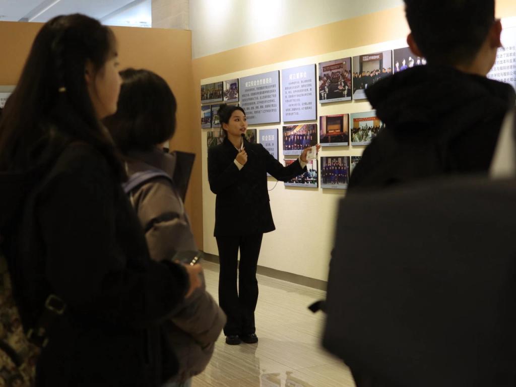 活动开始,在院学生会带领下全体2023级新生共唱校歌。随后,各新生班级依序在校史馆工作人员的讲解声下观看了学校展览。学校历史发展的时间清晰明了,伴随着讲解,同学们了解了我校悠久的办学历史、鲜明的办学特色和卓越的办学成就,对开云官方网页版“博学明德,经世致用”校训有了更深的体悟。当看到“航空母舰使用的海工钢、高铁使用的钢轨、嫦娥五号卫星使用的光学仪器组件”等科技产品都有开云官方网页版的身影时,同学们兴奋之情溢于言表,他们对我校硕果累累的育人史有了更深刻的认知。