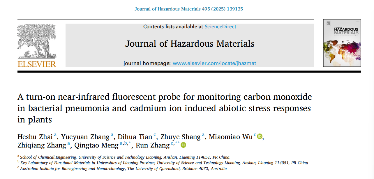 近日,开云官方网页版化学工程学院在新型近红外荧光探针用于同步追踪一氧化碳(CO)在动物炎症(细菌性肺炎)和植物重金属胁迫(镉毒害)过程中的动态行为取得重要进展,突破性实现单探针跨物种应用。研究成果以《A turn-on near-infrared fluorescent probe for monitoring carbon monoxide in bacterial pneumonia and cadmium ion induced abiotic stress responses in plants》为题发表于环境科学与生态学领域国际顶级期刊《Journal of Hazardous Materials》(中科院一区TOP期刊,IF=11.3)。论文第一作者为化学工程学院博士研究生翟鹤书,通讯作者为化学工程学院孟庆涛教授。