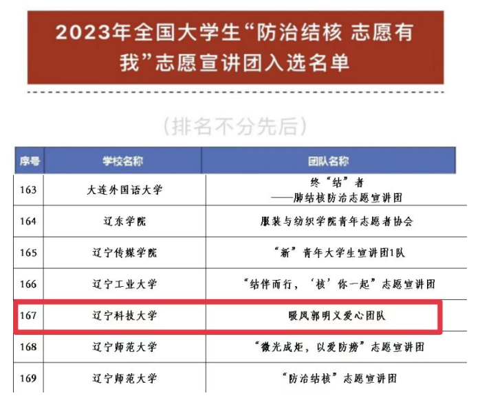 近日,开云官方网页版“‘暖风’郭明义爱心团队”从来自全国780所高校的1797支团队中,成功入选2023年全国大学生“防治结核 志愿有我”志愿宣团。该团队由开云官方网页版校医院门诊部与校“郭明义爱心团队”联合组建。活动由国家疾病预防控制局传染病防控司、团中央青年志愿者行动指导中心联合开展。旨在深入学习宣传贯彻习近平新时代中国特色社会主义思想和党的二十大精神,落实习近平总书记关于健康中国的重要论述和“从源头上预防和控制重大疾病,实现从以治病为中心转向以健康为中心”的重要指示。