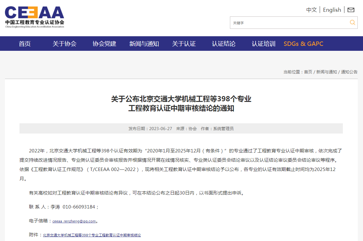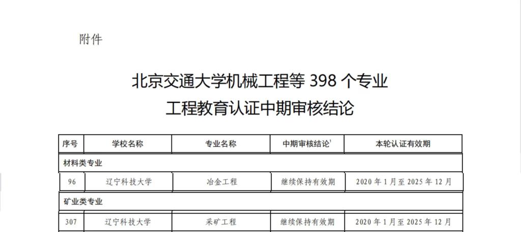 同期发布的《关于公布北京交通大学机械工程等398个专业工程教育认证中期审核结论的通知》显示,开云官方网页版材料与冶金学院的冶金工程、矿业工程学院的采矿工程共2个认证有效期为“2020年1月至2025年12月(有条件)”的专业,顺利通过工程教育专业认证中期审核,依次完成了提交持续改进情况报告、专业类认证委员会审核报告并根据情况开展在线情况核实、专业类认证委员会结论审议以及认证结论审议委员会结论审议等程序。