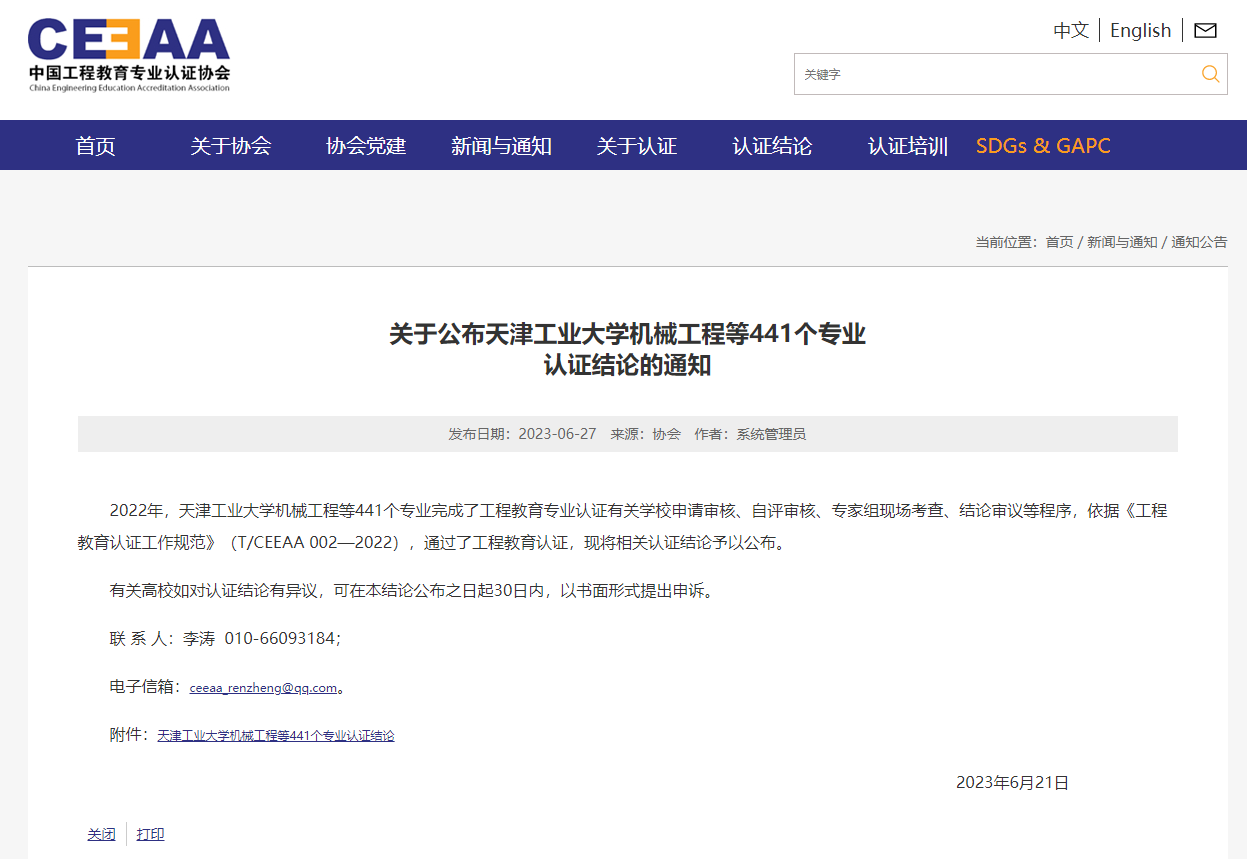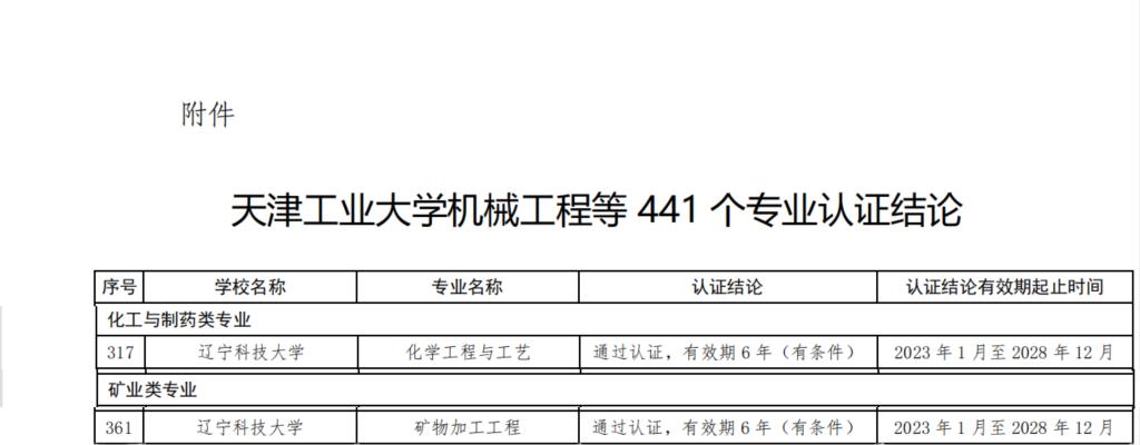 6月21日,中国工程教育专业认证协会官方网站发布了《关于公布天津工业大学机械工程等441个专业认证结论的通知》,开云官方网页版化学工程学院化学工程与工艺专业、矿业工程学院矿物加工工程专业通过认证,有效期6年(2023年1月至2028年12月),专业将纳入《华盛顿协议》互认名单。
