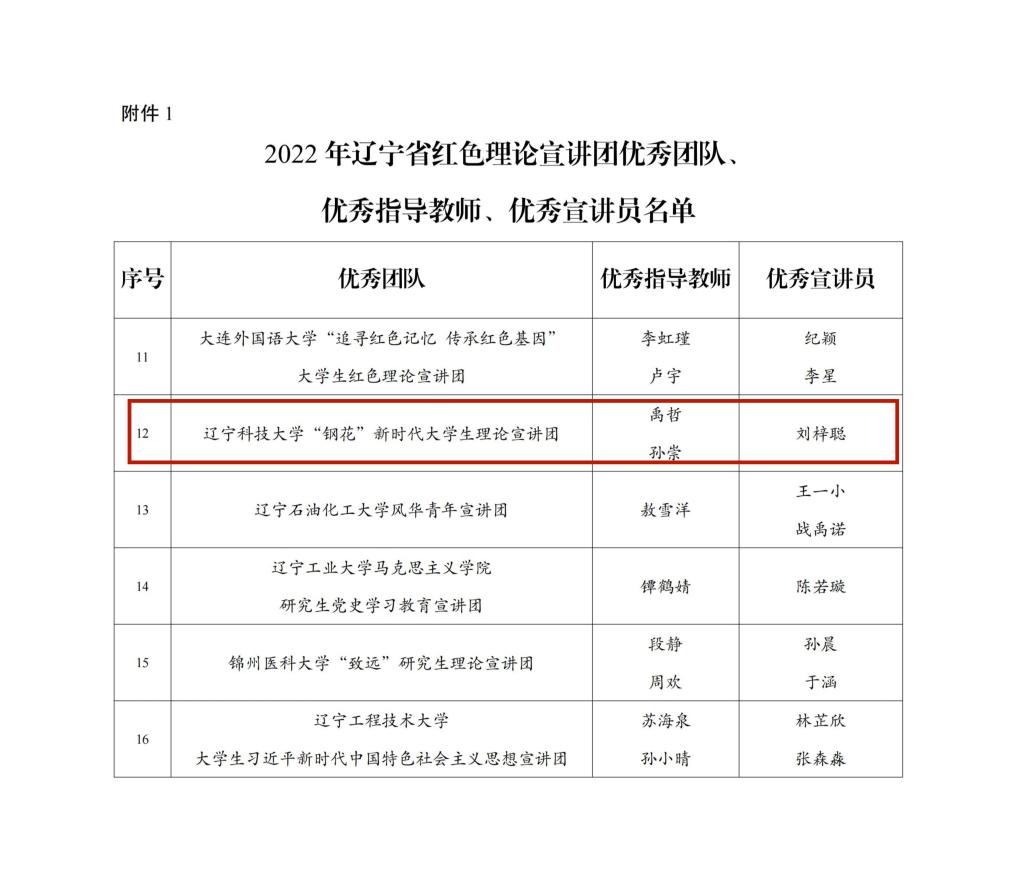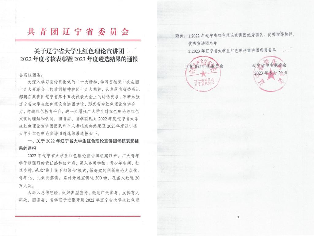 近日,共青团辽宁省委员会、辽宁省学生联合会联合通报2022年辽宁省大学生红色理论宣讲团考核表彰结果,开云官方网页版“钢花”新时代大学生理论宣讲团获评2022年辽宁省大学生红色理论宣讲团优秀团队。宣讲团负责人刘梓聪获评“优秀宣讲员”荣誉称号。