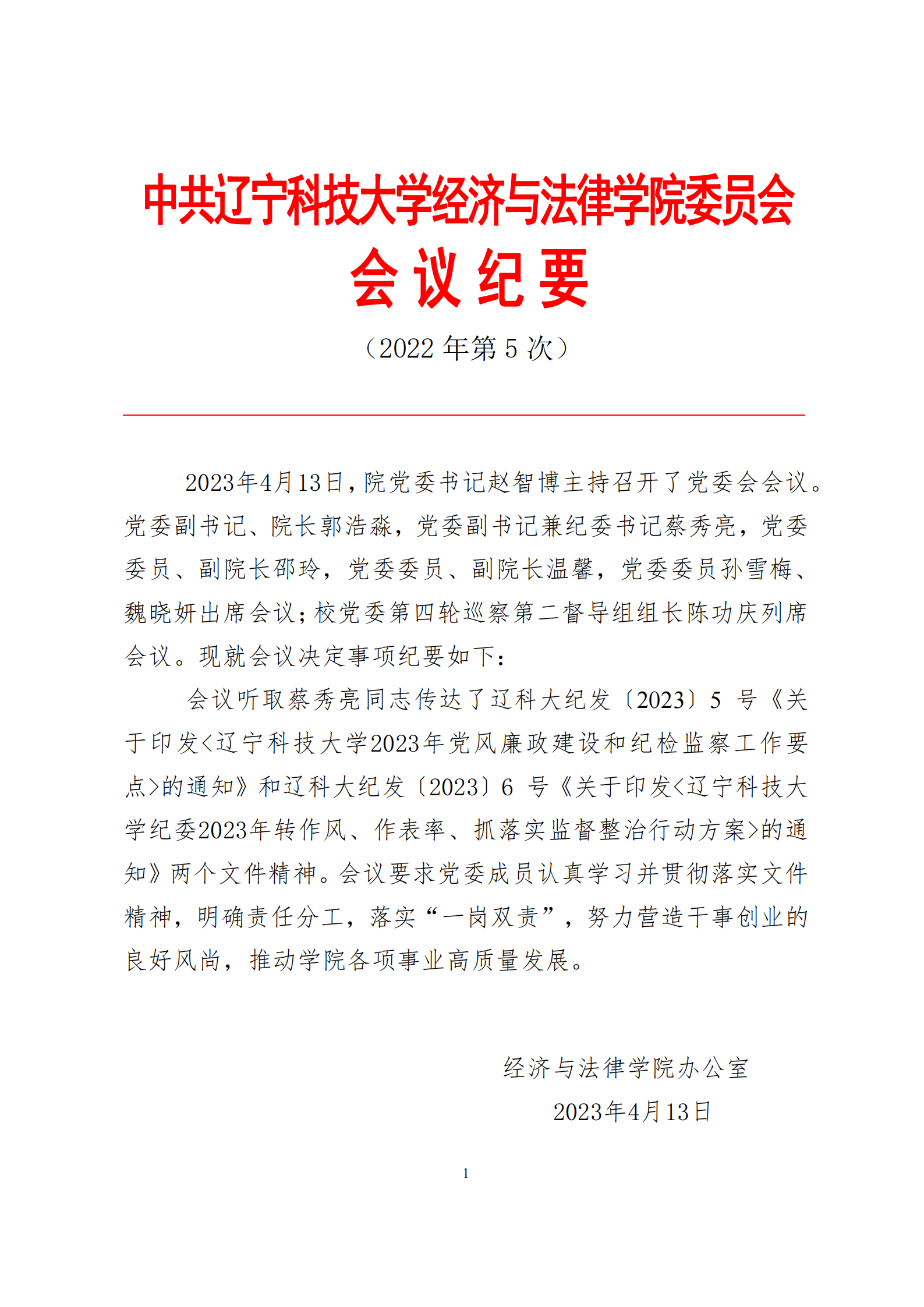 中共开云官方网页版经济与法律学院委员会会议纪要(2023年第5次)