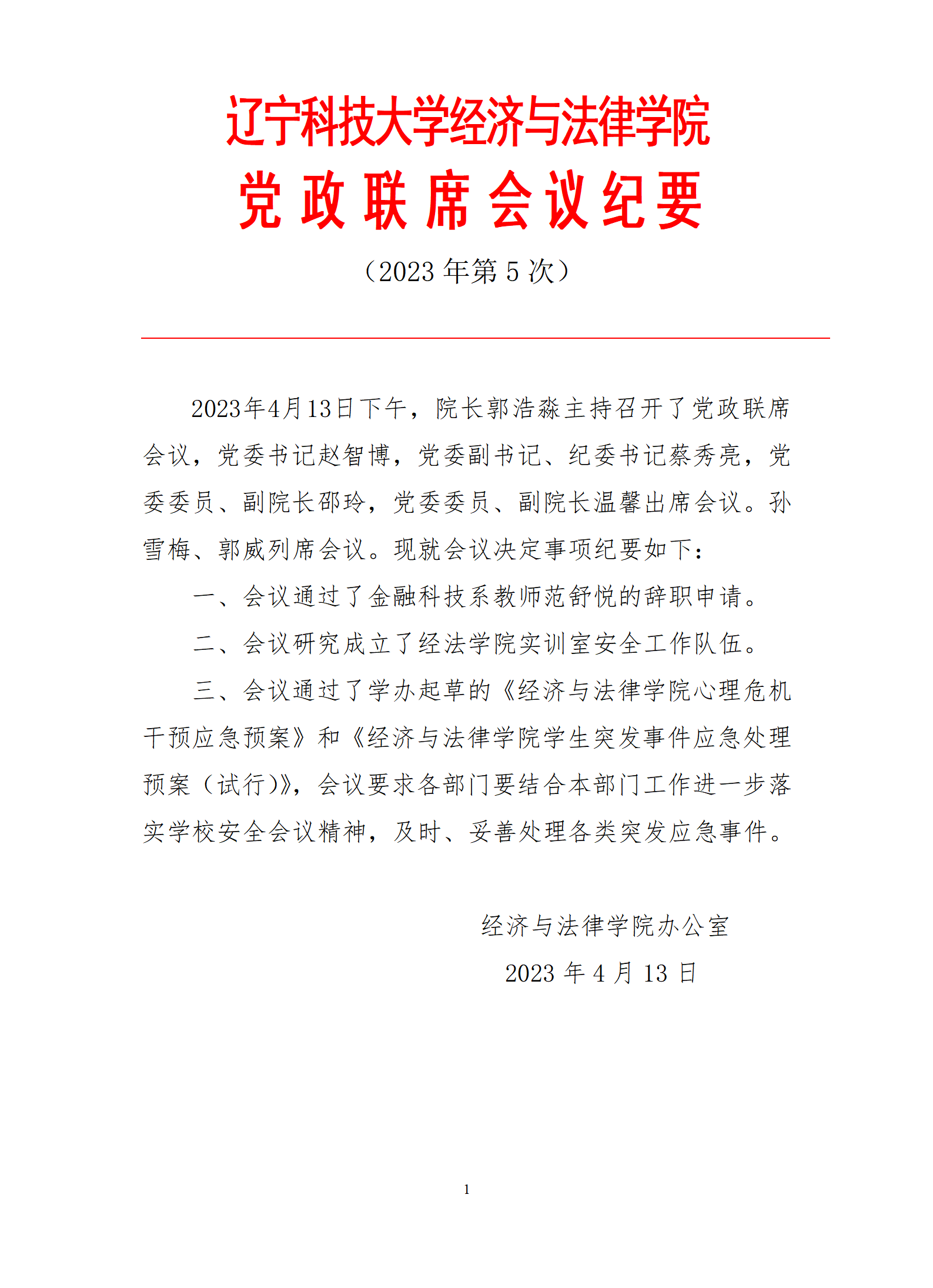 经法学院党政联席会议纪要(2023年第5次)
