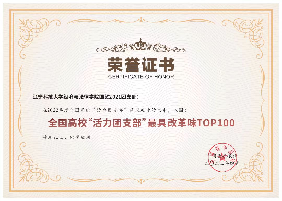作为学院团委(学生)副书记,该生在工作上一丝不苟,认真踏实,从不假公济私;作为团支部书记,该生能够认真的做好每一件事情,赢得班级同学的信任与支持。良好的道德品质、端正的思想态度和身体力行的工作作风促使该生做到了德、智、体、美、劳全面发展,体现了一名团学骨干的基本素养。在该生以及所在团支部团员青年的共同努力下,国贸21班团支部获评2022年度全国高校“活力团支部”最具改革味TOP100的荣誉称号。