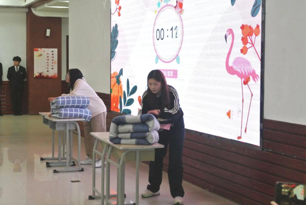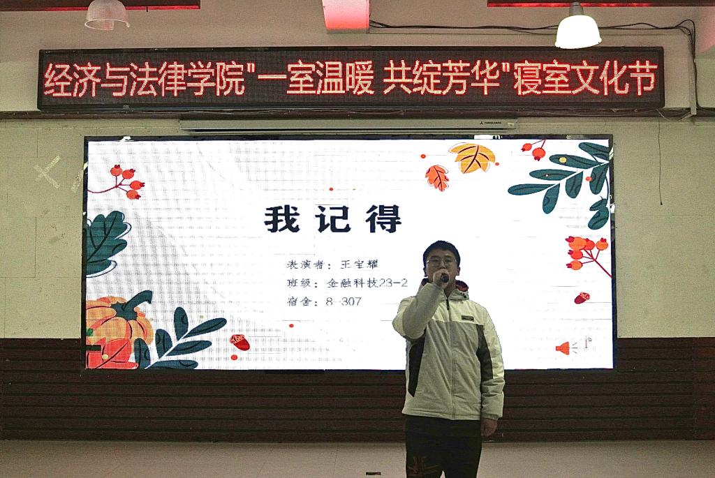 活动中,Vshow舞团开场的精彩表演点燃了观众的热情,现场气氛瞬间升温,活动正式拉开序幕。本次寝室文化节共分为“寝室vlog大赛”“才艺大赛”和“叠被子大赛”三个环节。随着全场热烈的掌声,“寝室vlog大赛”将各参赛寝室成员们精彩纷呈的寝室生活呈现在观众眼前。选手们通过照片、视频、采访等各种各样的形式记录了寝室成员之间的点点滴滴,展现了寝室生活的温馨日常以及各寝室成员们独特的闪光点。“才艺大赛”上,选手们各显神通,给观众带来了一场视听盛宴。小品《勇闯301》以诙谐的剧情、滑稽的动作让现场笑声不断;歌曲《年轮》、诗朗诵《面朝大海,春暖花开》、舞蹈串烧等表演以充沛饱满的情感诠释了经法学子们积极向上、意气飞扬的寝室风采,体现了寝室成员们热情奔放的精神面貌,赢得了在场老师和同学们的阵阵掌声。修明武术协会和金融21班秦煜宁的串场表演以及“抱团游戏”将气氛再次推向高潮,现场欢呼喝彩声不断。“叠被子大赛”环节中,随着主持人一声令下,参赛同学迅速进入状态,即便两位主持人不断提问干扰,选手们依然细致认真地整理被子,现场气氛热烈,欢呼不断。两分钟后,一块块棱角分明的“豆腐块"展现在观众面前,赢得了观众的热烈掌声。由韦敏玲、何运来、周思彤为大家带来的舞蹈串烧,表演精彩绝伦,令人印象深刻。