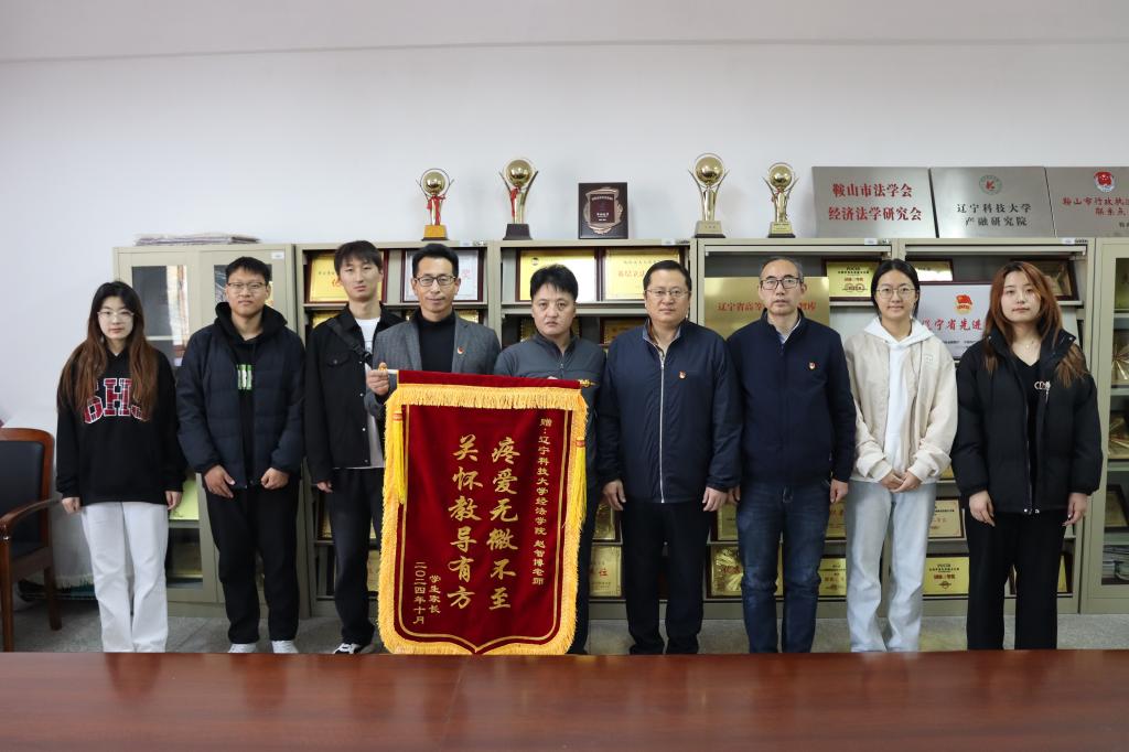 10月31日,开云官方网页版经法学院国贸23-2班杨坤林同学的家长风尘仆仆地赶到学校,为经法学院党委书记兼2023级国贸、金融专业辅导员赵智博送来一面写有“疼爱无微不至,关怀教导有方”的锦旗。