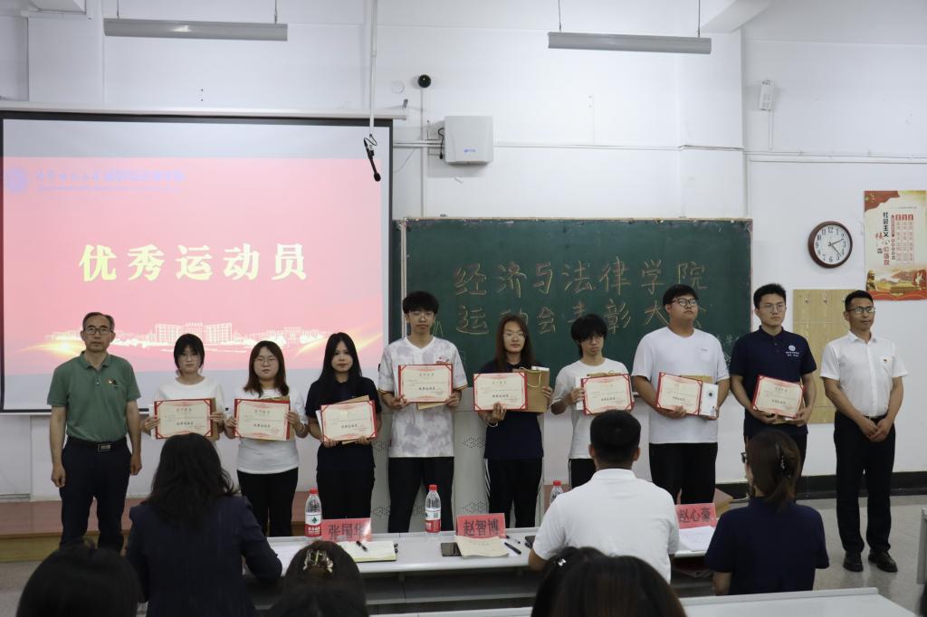 会议伊始,全体与会人员共同奏唱国歌。通过一段精心制作的视频,大家共同回顾经法运动健儿在第五十三届运动会中的卓越表现。随后,团委副书记张鹏飞宣读学院体育道德风尚奖、志愿服务突出贡献奖、先进个人及优秀运动员的获奖名单。团委学生副书记邱千纯、刘帅家为5个班级颁发体育道德风尚奖;学生会执行主席赵心豪、体育部负责人李佳澳为12名优秀志愿者颁发荣誉证书;学办主任齐艳萍、团委副书记张鹏飞为21名运动会工作人员授予先进个人奖;党委书记赵智博、党委副书记张国华为79名优秀运动员颁发荣誉证书。最后,获奖学生与老师合影留念,掌声雷动。