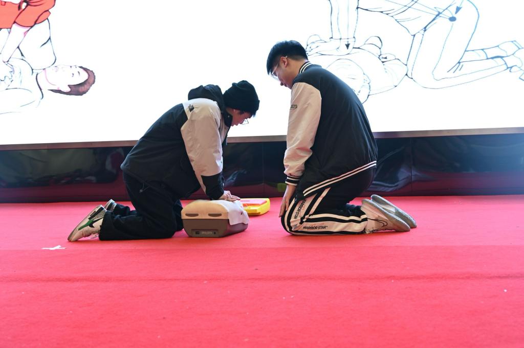 在演练过程中,老师以师徒制分组方式安排学生轮流上阵展开演练,“不要靠单手手臂力量去做心肺复苏,要充分利用全身力量去按压”“每分钟按压100到120下,深度5到6公分”……培训老师对同学们进行详细指导,及时纠正不当操作,同时耐心且细致地解答了同学们提出的问题,让大家受益匪浅。轻松愉悦的学习氛围令学生们的学习热情高涨,在寓教于乐中使学生亲身体会到急救知识和技能在生活中的重要作用,同学们纷纷表示在意外伤害发生时,将运用所学急救知识积极地伸出援助之手,以最大限度为他人争取生存机会,为自己也为他人的生命安全保驾护航。