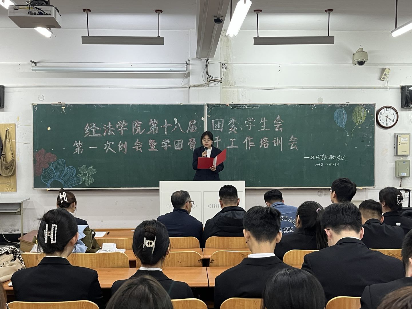 会议伊始,吴雨纯首先向大家介绍了团委、学生会的工作职能,强调了学团骨干服务同学的工作理念以及发挥的重要作用。随后,她向大家宣读了《经济与法律学院学生会工作章程》,解读了各项规章制度,对各团学骨干的行为作出了规范。