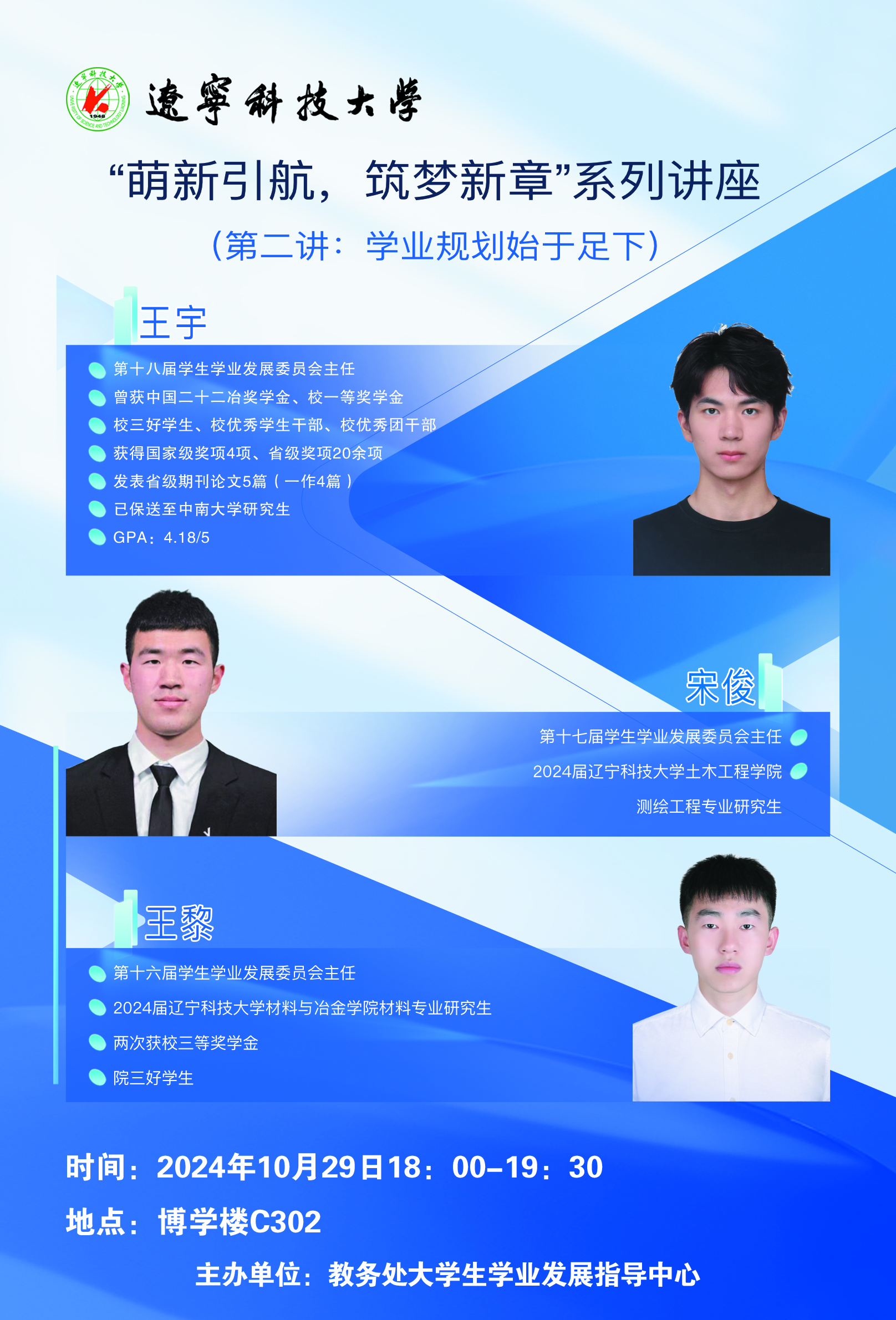 10月29日,教务处大学生学业发展指导中心面向2024级新生举办的“萌新引航,筑梦新章”系列讲座第二讲《学业规划始于足下》在博学楼C302教室开讲。开云官方网页版学生学业发展委员会历届主任王宇、宋俊、王黎为学校300余名新生作讲座。