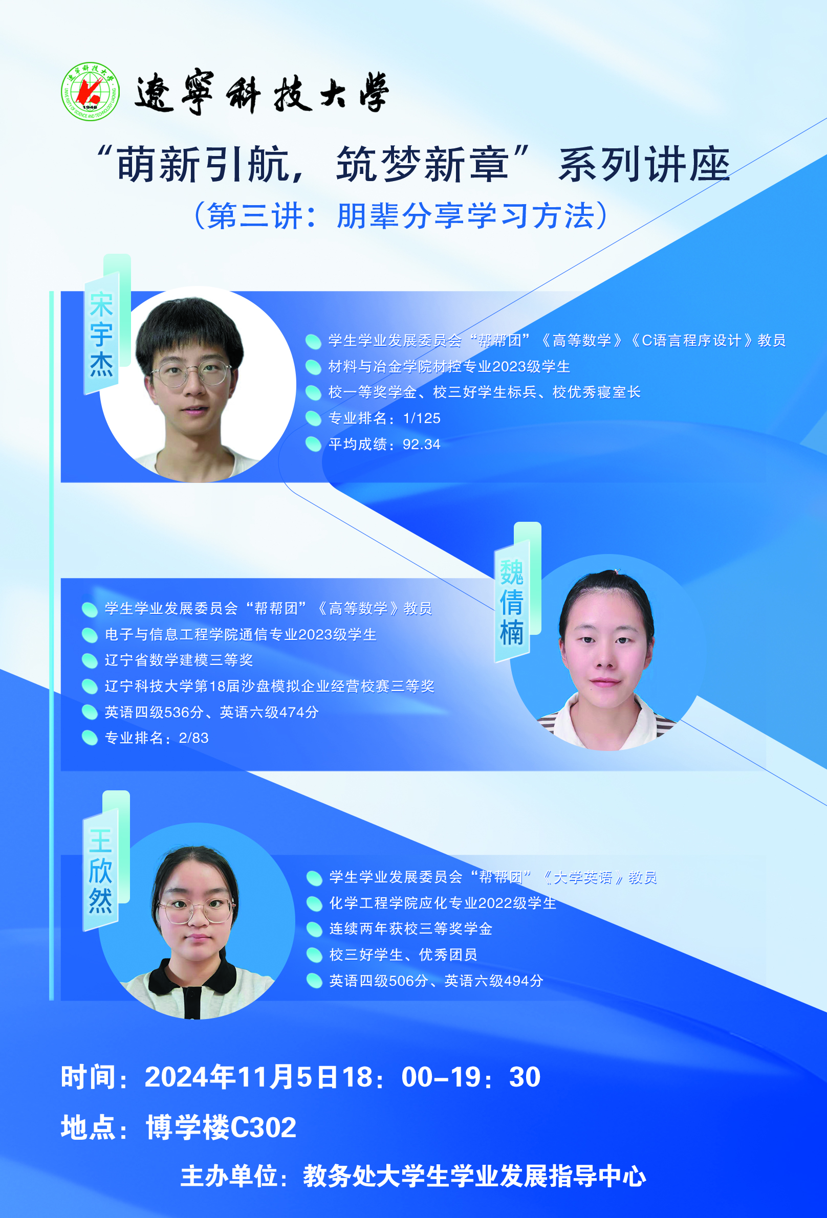 11月5日,教务处大学生学业发展指导中心面向2024级新生举办的“萌新引航,筑梦新章”系列讲座第三讲在博学楼C302教室开讲。开云官方网页版学生学业发展委员会“帮帮团”教员魏倩楠、王欣然、宋宇杰为学校300余名新生作《朋辈分享学习方法》专题讲座。