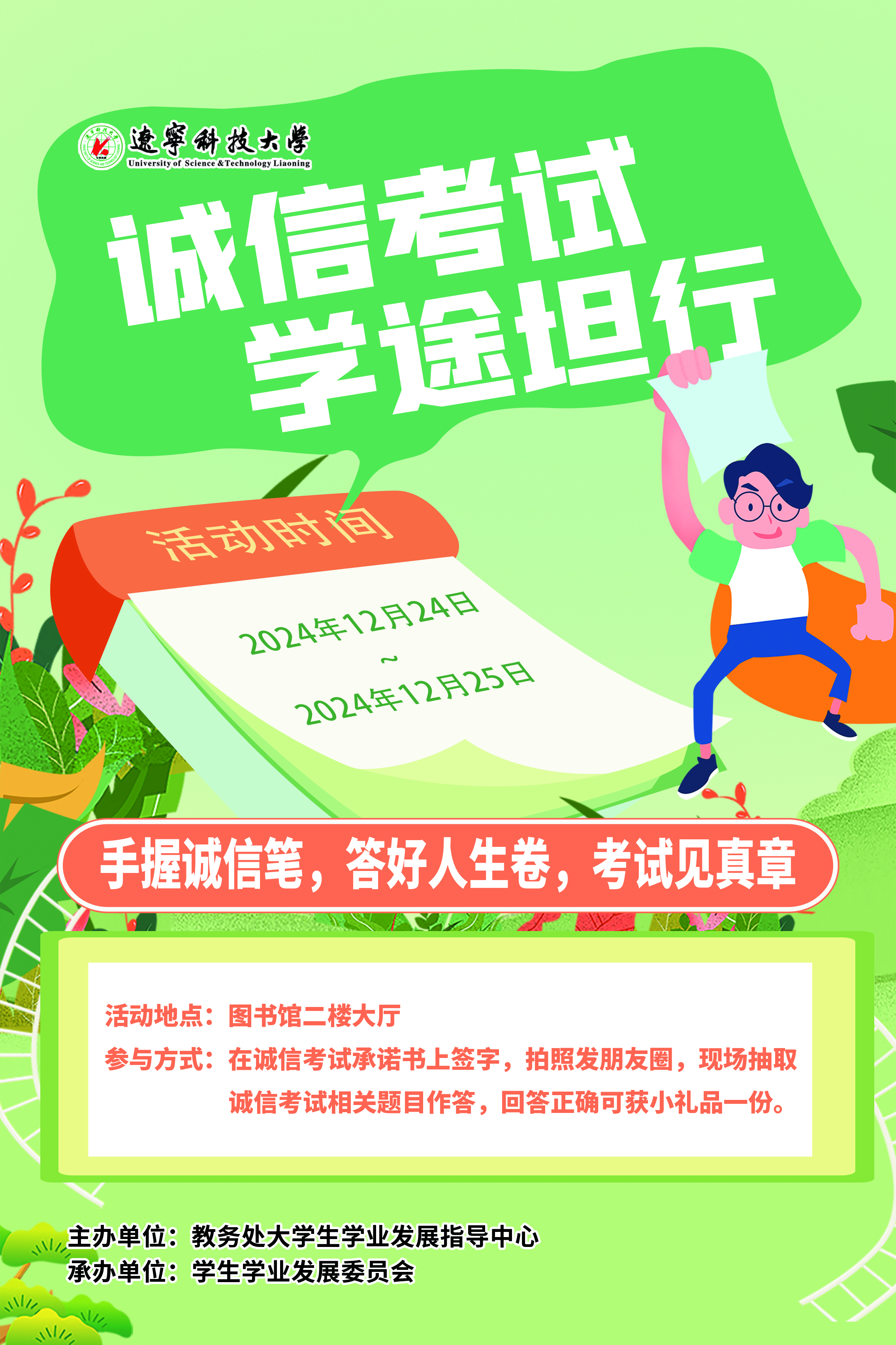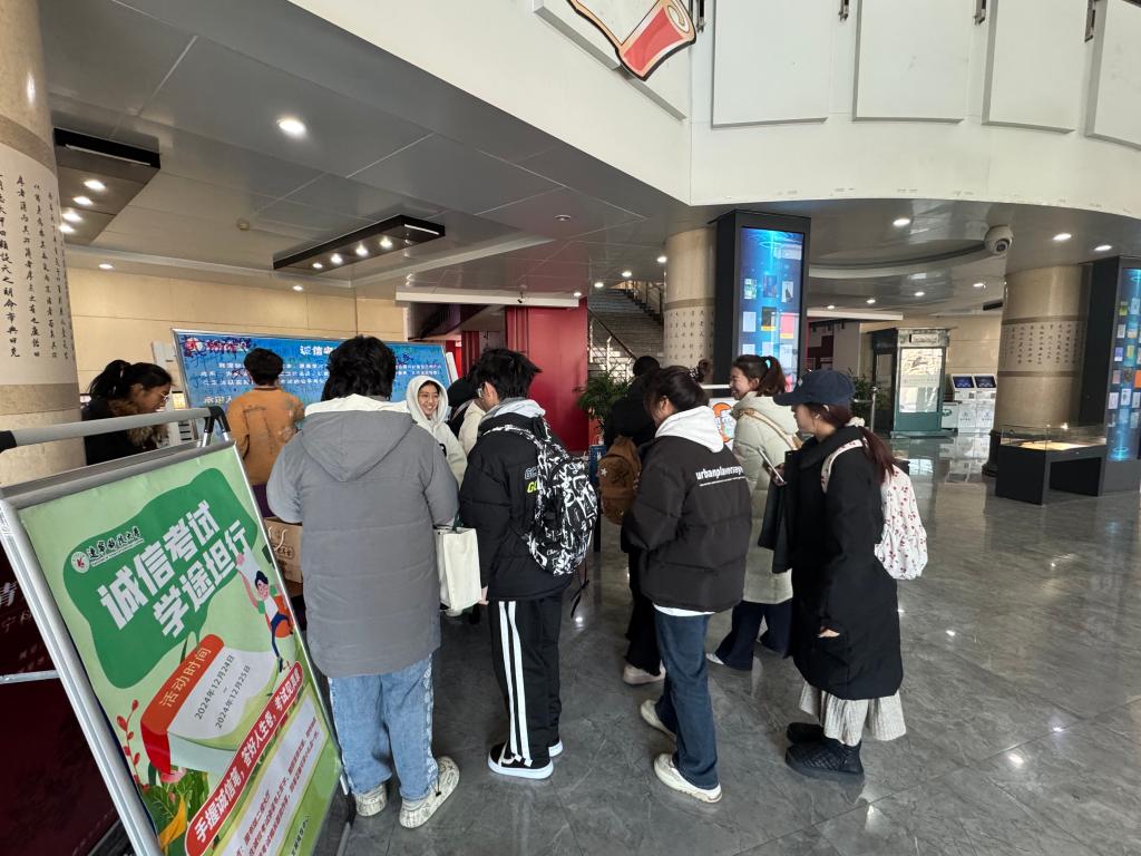 12月24日至12月25日,由教务处大学生学业发展指导中心主办、学生学业发展委员会承办的“诚信考试,学途坦行”主题活动于图书馆二楼大厅举行,活动吸引了1000余人参与。活动旨在通过趣味多元的形式,向同学们深入传递诚信考试的重要理念,助力营造良好的校园考试风气。