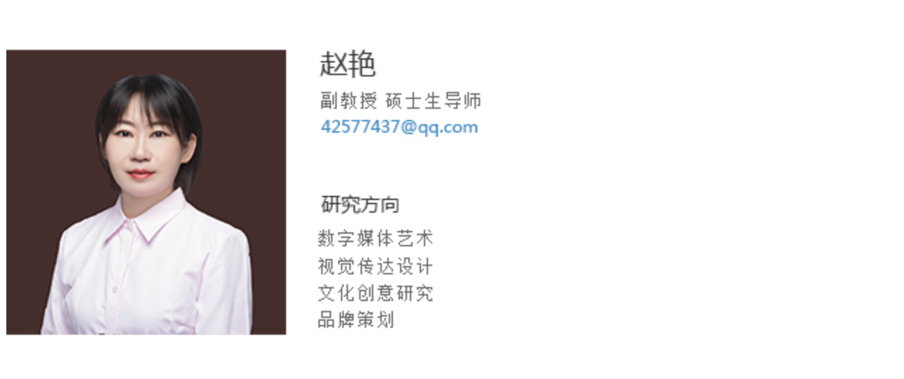 赵艳副教授,大连工业大学设计学硕士。曾担任中国大学生广告艺术节学院奖评委;多年从事文化创意设计领域研究,出版《中国传统文化创意设计》等著作;撰写文化创意设计相关论文多篇;《中华优秀传统文化的创造性转化与创新性发展研究》等多项文化研究课题获批辽宁省社会科学规划基金等立项,相关教改课题获批国家教育部产学合作育人项目;指导学生获大学生创新创业训练省级项目4项;获靳埭强全球华人设计大奖银奖、全国公共机构节能宣传大赛二等奖;全国大学生广告艺术大赛国家级一等奖、二等奖、三等奖多次;中国大学生计算机大赛二等奖、三等奖多次;红色文化创意大赛等赛事等级奖多项;曾获辽宁省教育软件大赛高教组二等奖、三等奖,全国多媒体课件大赛一等奖、三等奖;辽宁省信息化教育大赛微课组三等奖;校级优秀教案大赛一等奖;校级课堂教学大赛一等奖;校级教学改革与教学建设成果二等奖 ;首届考试方式方法改革试点课程优秀成果一等奖;开云官方网页版第五届“名师示范课”主讲教师;校园先锋工程教学先锋岗;校级教学质量优秀奖。