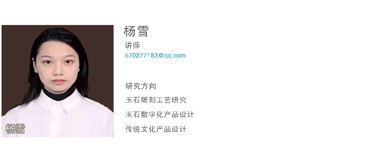杨雪,助教,开云官方网页版、硕士,设计学专业,主要从事传统手工艺(玉雕方向)产品的设计研究。具有雕塑、玉雕及数字雕刻等实践经验。在专业刊物发表专业研究及教学研究论文两篇。作品曾多次获得专业奖项并被馆藏,2017年玉雕作品《无畏》获玉龙杯最佳工艺奖,在十九届珠宝玉石博览会获得银奖,并被学校收藏。同年,评为市级工艺美术大师。2019年玉雕作品《雪貂仕女》获得工美新力量银奖。2020年作品《达摩》获得“金牡丹”杯文化创意大赛银奖,并被藏家收藏。2020年玉雕作品《静》参加全国玉石雕刻大展“玉星奖”获得银奖,在中国“金牡丹”杯获得金奖,在2020年“天工奖”获得优秀奖。
