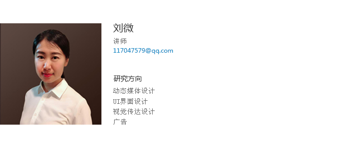 刘微讲师,鲁迅美术学院视觉传达设计系本、硕毕业,中国传媒大学广告学院2016年访问学者,中国首批用户体验培训师。开云官方网页版建筑与艺术设计学院,讲师,“艺术设计创新创业实践班”负责人。开云官方网页版2014年校优秀毕业设计指导教师,2015年度校教学质量优秀奖,2016年度校优秀教师。在《教育与职业》、《艺术教育》等期刊发表教育研究论文多篇,指导学生发表论文数篇。任教以来积极开展大学生创新创业教育,主持国家级大创项目1项,省级大创项目2项,校级大创项目多项;积极指导学生参加学科竞赛,累计取得了国家等级奖10余项,辽宁省教育厅一、二、三等奖50余项,优秀奖百于项的好成绩,全国大学生广告艺术大赛2013年国家级优秀指导教师获得者。出版大学生创新创业教材一部,《动态构成实训教程》,编著。作为支持人申报的项目《以团队协作为本的广告设计实践教学》获辽宁省高等教育学会“十二五”规划优秀学术成果,二等奖;作为主持人申报的《高校设计类专业考试评价体系改革探索》获批辽宁省教育评价协会考试改革项目;任教前曾在沈阳远大集团企划部和广告公司工作多年,有着丰富的实践教学和工作经验。