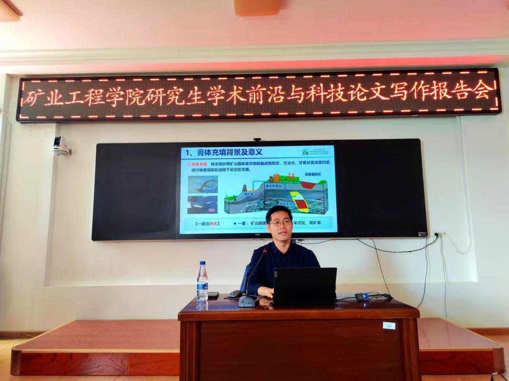 在博爱楼425会议室举办的研究生学术前沿与科技论文写作报告会,特邀北京科技大学陈秋松教授、辽宁工程技术大学孙琦教授两位业内专家,分别围绕“膏体充填的认识、研究与展望”和“研究生科技论文写作”作专题报告。陈教授从膏体充填的基本认知入手,深入讲解了该领域的研究进展,同时对其未来发展趋势进行了前瞻性展望,为在场师生呈现了矿山充填技术的前沿图景,助力大家把握行业技术革新方向。孙教授聚焦研究生科技论文写作,从论文选题、框架构建、逻辑梳理到语言表达等多个维度,结合自身科研与论文指导经验,为研究生们提供了极具实用性的写作指导,助力大家提升论文写作水平,更快产出高质量学术成果。
