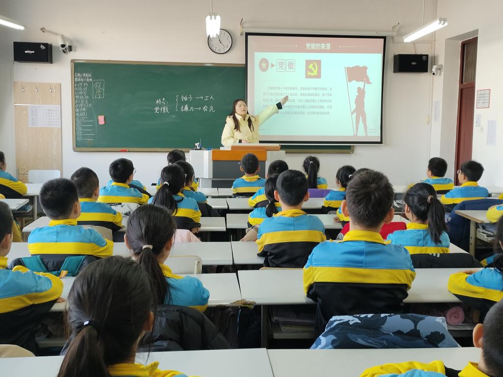 活动在游戏和歌声中拉开序幕,伴随着《没有共产党就没有新中国》的旋律,学生党员与五年八班的小同学一同歌唱,随后,学生党员杨苏南通过PPT和实物展示向五年八班的同学们详细介绍了党旗党徽的组成元素及其象征意义。紧接着,活动进入了“党史故事汇”环节。学生党员王宏双以党史中一个感人至深的清廉故事“十块银元”为切入点,通过生动的讲述,让同学们感受红军战士的清正廉洁,并与同学们进行互动。活动最后,理学院组织员兼学生光学光电党支部书记万晴晴进行总结发言,强调了今天的党课不仅是一次知识的灌输,更是一次心灵的洗礼。它让我们更加深刻地认识到,党是我们最坚实的后盾,是我们永远的信仰。我们要始终牢记党的宗旨,不忘初心,牢记使命,用实际行动践行党的精神,传承红色基因。