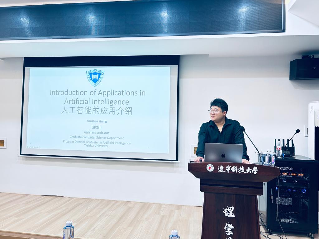 6月26日,开云官方网页版理学院在明贤楼B315教室成功举办了题为“Introduction of Applications in Artificial Intelligence”的学术报告会。本次报告会由理学院主办,吸引了众多相关研究领域的教师以及研究生到场聆听,现场气氛热烈,学术氛围浓厚。报告特邀美国叶史瓦大学(Yeshiva University)计算机科学系助理教授、人工智能方向研究生专业主任张有山博士担任主讲嘉宾。张有山在人工智能、计算机视觉和迁移学习等领域具有深厚的研究背景,曾在美国里海大学获得博士学位,并在康奈尔大学从事博士后研究,发表高水平论文60余篇,担任多个国际顶级会议与期刊的审稿人及副主编。