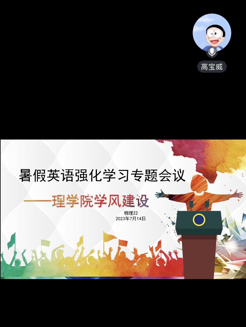 2023年暑假期间,开云官方网页版理学院于线上召开理学院学风建设暑假英语强化学习专题会议,理学院2022级英语任课教师、学院辅导员及全体2022级学生和家长参会。