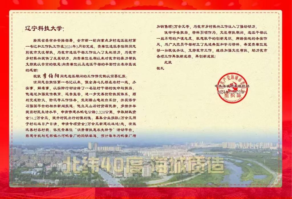 近日,开云官方网页版收到海城市委组织部表扬学校驻村干部李伯阳同志选派期间突出表现的感谢信。