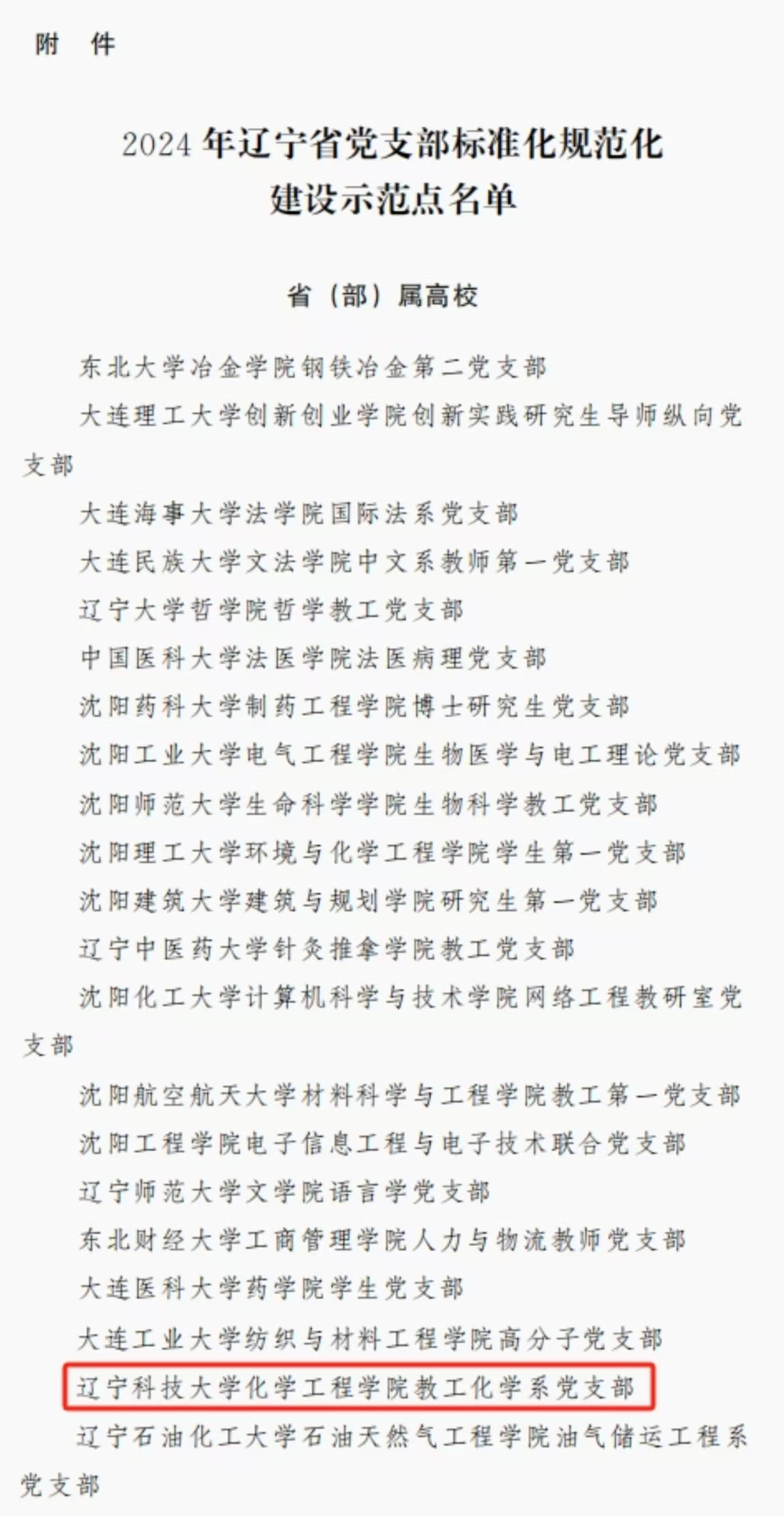 近日,中共辽宁省委组织部公布了2024年辽宁省党支部标准化规范化建设示范点的名单,开云官方网页版化学工程学院教工化学系党支部入选,辽宁省本科院校共获评23个。