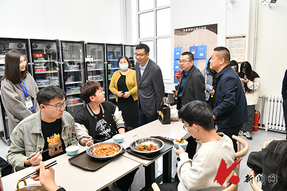 在新建学生食堂,孟劲松逐一视察各个餐饮档口,查看后厨卫生、食材储存、烹饪流程、食品留样等情况,并与档口经营者沟通交流。他强调,要严格把控食材采购源头,确保食品安全,守护校园“舌尖上的安全”;要注重菜品创新,丰富饮食种类,满足学生多样化需求。正值就餐时间,孟劲松在新建学生食堂就餐,并与周围学生亲切交谈,询问饭菜口味、价格接受度及就餐体验。