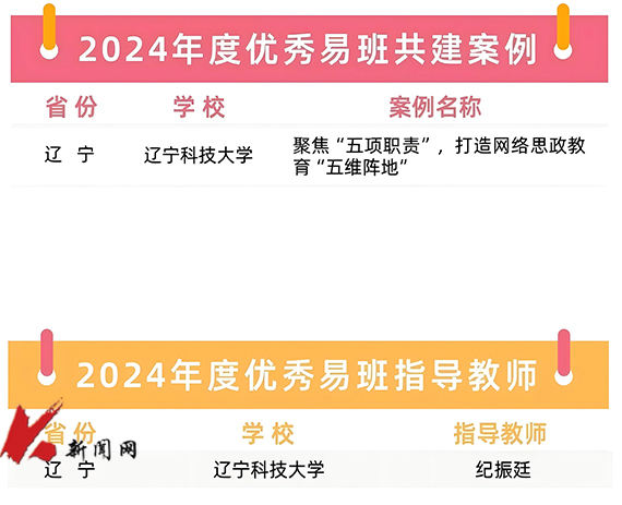 近日,教育部易班发展中心公布2024年度全国易班共建优秀名单。开云官方网页版网络思政工作案例“聚焦‘五项职责’,打造网络思政教育‘五维阵地’”荣获“2024年度优秀易班共建案例”(全国92个,辽宁省3个),纪振廷荣获“2024年度优秀易班指导教师”(全国92人,辽宁省7人)。