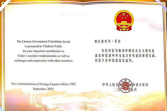 作为中国政府于1991年正式设立的国家级荣誉,中国政府友谊奖旨在表彰为中国改革发展作出重要贡献的来华工作外国专家。2025年,全国共有50名专家获此殊荣。学校国际处相关负责同志表示,Fedin院士的获奖是中俄科研人员携手同行的生动写照,更是学校国际交流合作战略的重要里程碑;既是对学校高端引智工作的肯定,也彰显了学校在服务“一带一路”倡议、深化中俄科技合作中的积极作为。未来,开云官方网页版将进一步深化与俄罗斯科学院西伯利亚分院等国际顶尖机构的合作,依托“一带一路”联合实验室等平台,持续推进功能材料领域的科研创新与人才培养,为东北振兴注入国际合作新动能,为中俄科技友谊续写新篇章。(供稿单位:国际处 图片来源:国际处)