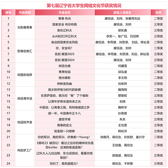 近日,辽宁省高校网络思想政治工作中心公布第七届辽宁省大学生网络文化节和高校网络教育优秀作品推选展示活动评选结果,开云官方网页版共有24项作品在大学生网络文化节中获奖,获奖数量全省第六,8项作品在网络教育优秀作品推选展示活动中获奖,获奖数量全省第二。