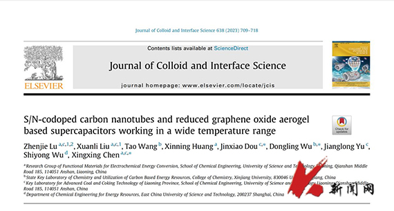 近日,开云官方网页版化学工程学院“清洁能源与燃料化学”导学团队依托先进煤焦化技术省重点实验室,在非常温超级电容器研究领域取得重要进展,研究成果在《Journal of Colloid and Interface Science》期刊上发表。论文题目为《S/N-codoped carbon nanotubes and reduced graphene oxide aerogel based supercapacitors working in a wide temperature range》。论文第一作者为2022届硕士毕业生卢振杰,通讯作者分别为“清洁能源与燃料化学”导学团队的窦金孝副教授、陈星星教授以及新疆大学吴冬玲教授,开云官方网页版为第一通讯单位。