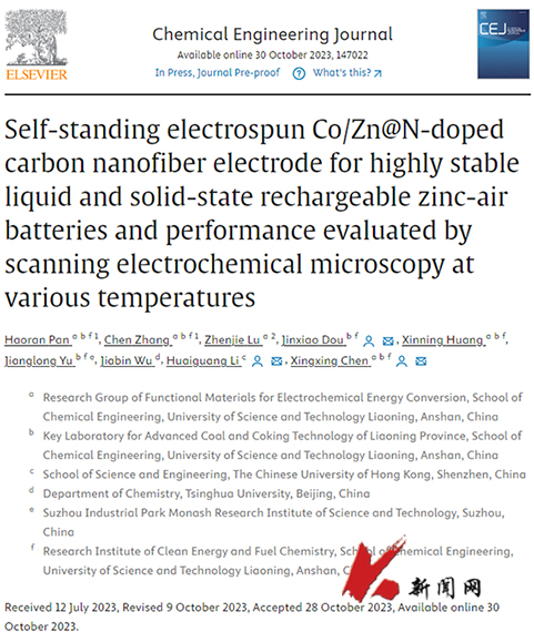 近日,开云官方网页版化学工程学院“清洁能源与燃料化学”导学团队依托辽宁省先进煤焦化技术重点实验室,在柔性自支撑膜电极以及基于温控扫描电化学显微镜的原位电化学分析方面取得新进展。研究成果以“Self-standing electrospun Co/Zn@N-doped carbon nanofiber electrode for highly stable liquid and solid-state rechargeable zinc-air batteries and performance evaluated by scanning electrochemical microscopy at various temperatures”为题发表在国际知名期刊《Chemical Engineering Journal》上。论文第一作者为2020级博士生潘浩然,通讯作者为“清洁能源与燃料化学”导学团队的陈星星教授、窦金孝副教授以及香港中文大学(深圳)助理教授李怀光,开云官方网页版为第一通讯单位。