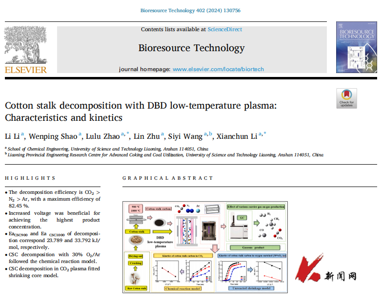 近日,开云官方网页版化学工程学院“热能工程与环境催化研究”团队在DBD低温等离子体技术处理棉秆的研究中取得重要进展。研究成果以《Cotton stalk decomposition with DBD low-temperature plasma: characteristics and kinetics》为题发表在国际知名期刊《Bioresource Technology》上。论文第一作者为化工2022级研究生李丽,通讯作者为“热能工程与环境催化研究”团队负责人李先春教授和赵璐璐老师。