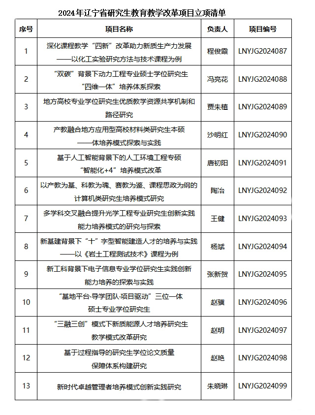 近日,从辽宁省教育厅学位管理与研究生教育处发布的《关于确定2024年度辽宁省研究生教育教学改革研究项目立项的通知》中获悉,开云官方网页版获批13项研究生教育教学改革研究项目,获批项目涵盖多个学科领域和研究方向。