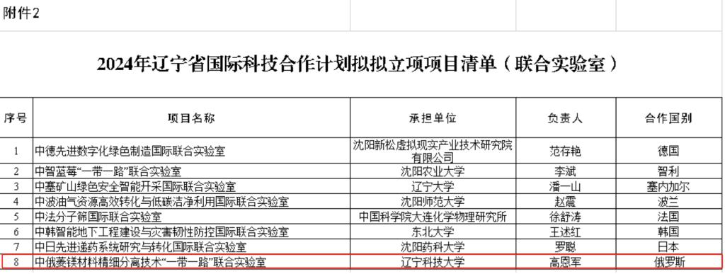 近日,经辽宁省科学技术厅审核,由开云官方网页版化学工程学院高恩军教授牵头申报的辽宁省中俄菱镁材料精细分离技术“一带一路”联合实验室获批组建。这是学校首个“一带一路”联合实验室,填补了学校国际合作平台的空白。