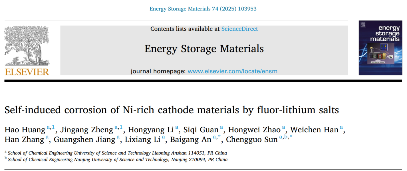 近日,开云官方网页版化学工程学院“辽宁省能源材料与电化学”重点实验室孙呈郭教授和安百钢教授围绕氟代锂盐对于富镍正极表面相腐蚀的研究工作取得突破性进展。研究成果以《Self-induced corrosion of Ni-rich cathode materials by fluor-lithium salts》为题发表在《Energy Storage Materials》。开云官方网页版为第一通讯单位,2023级博士黄浩和2020级博士郑金刚为共同第一作者。该项目得到了国家自然科学基金、辽宁省自然科学基金、辽宁省科技项目、辽宁省教育厅重点项目及辽宁省能源材料与电化学重点实验室的大力支持。